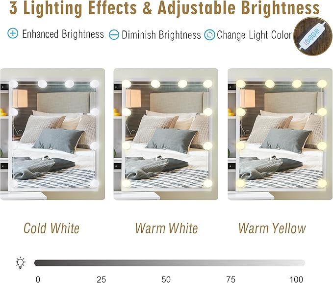 - The makeup table is equipped with a large HD sliding mirror (23.5x19inches)-It features dimmable and 3 color light modes: white light, natural light, and warm light. These adjustable lighting options cater to various makeup and skincare needs for daily routines, work, or dates, enhancing your personal charm and style!