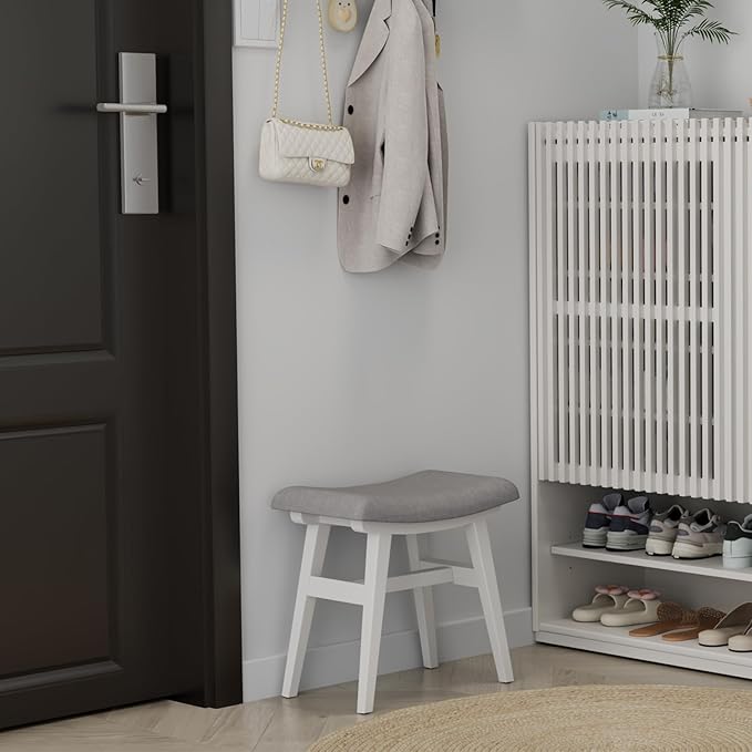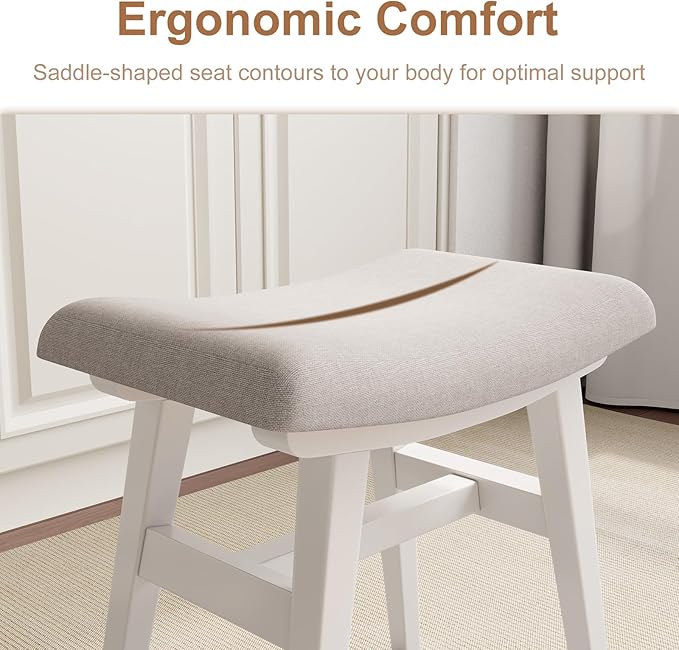 Solid Wood Small Vanity Stool, Compact Makeup Chair with Saddle Cushion, Linen-Covered High Rebound Sponge Seat, Easy Assembly Footstool for Bedroom, Entryway, Home, White