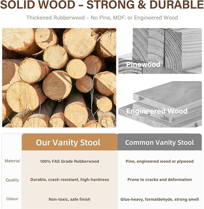 - 【DURABLE SOLID WOOD STOOL】Made from 100% FAS-grade rubberwood, this vanity stool features a finely sanded, burr-free finish. I-beam construction ensures lasting sturdiness and stability for years