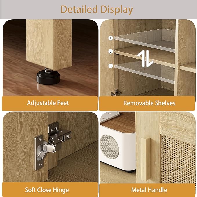 - Rattan TV Stand: This TV stand with Rattan Doors artfully combines a laid-back, organic aesthetic with the enduring allure of minimalism. The warm woodgrain finish brings a natural vibe that seamlessly complements your home decor, creating a cozy and inviting atmosphere. With its modern sensibility and smart storage solutions, it's versatile enough for the bedroom, living room, or entryway. Perfect as your entertainment center, simply set up your TV and display favorite accents - whether in the lounge, private quarters, or even office spaces, it delivers both style and everyday functionality.