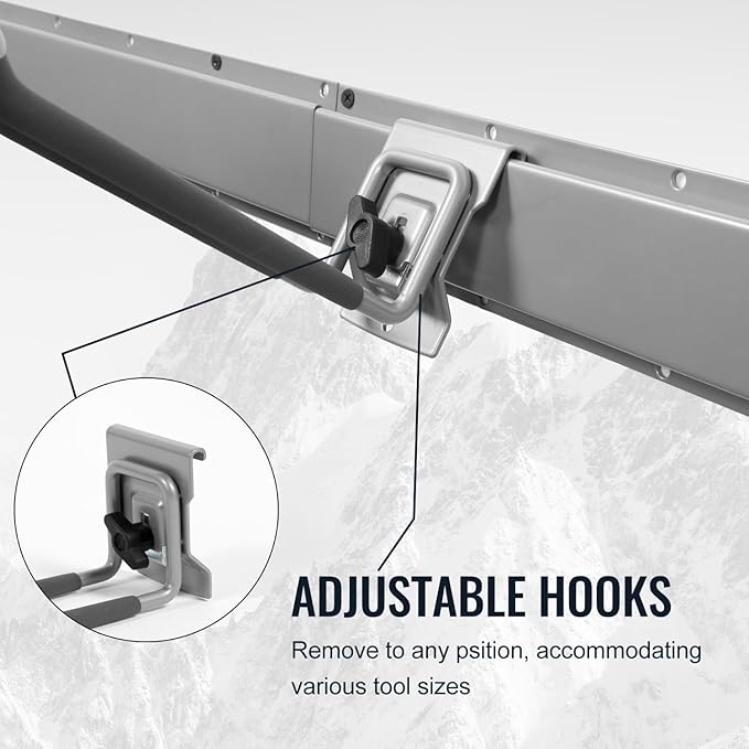 - ADJUSTABLE VERSATILE STORAGE: With a clamping screw, the hooks adjust along the wall track, accommodating various tool sizes. This garage storage system is ideal for organizing shovels, rakes, brooms, and more, making it a perfect yard tool organizer for garage.