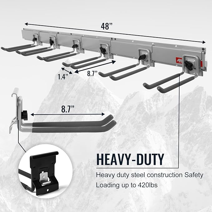 - HEAVY DUTY STEEL CONSTRUCTION: Crafted from industrial-grade steel, our garage tool hanger is incredibly durable, supporting up to 420 pounds—perfect for heavy garden tools. These heavy-duty garage hooks are designed to last and handle your toughest tools