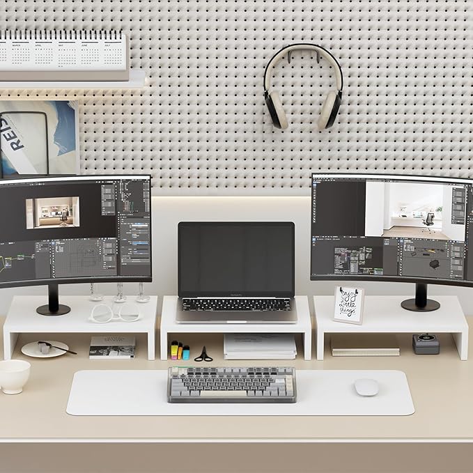 TEAMIX Monitor Stand Riser-3 Packs,Wood 3 Tiers Adjustable Monitor Stand Dual Monitor Riser for 2 Monitors/Laptop/PC Computer Stand for Desk (White, 3 PCS)