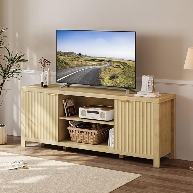 Fluted TV Stand for TVs up to 65'',Mid Century Modern Entertainment Center with Adjustable Shelves, Wood Media TV Console Cabinet with Fluted Doors for Living Roon Bedroom Natural LTV90Y