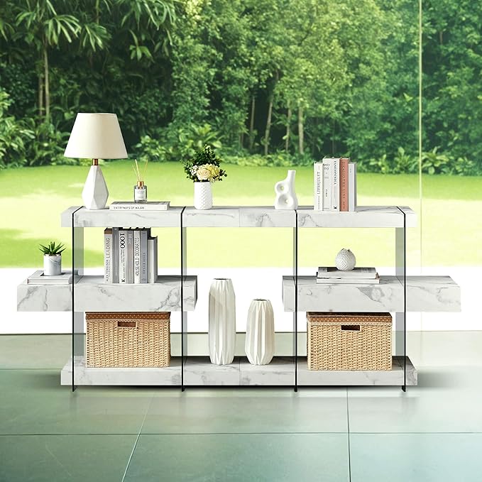 ivinta Glass Console Table with Storage Shelves, 3-Tier Modern Entryway Table with Hidden Drawer for Living Room Hallway or Entrance, 5104 (White, 39")