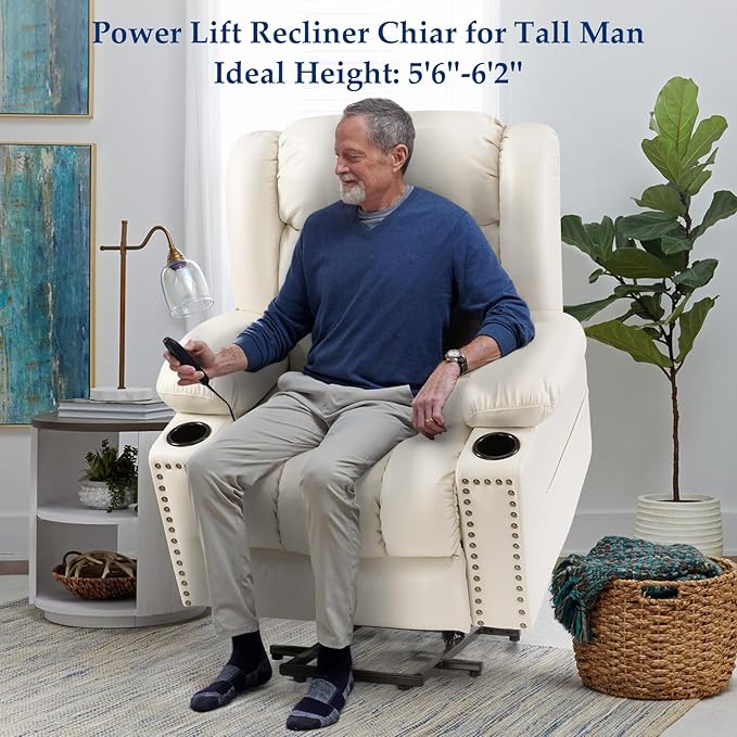 Large Power Lift Chair Recliner for Elderly with Heated and Massage, Overstuffed Adjustable Lift Chair, 3 Position, Breathable Leather, USB-A&USB-C, Cup Holder (Tall Man-7523, Beige)