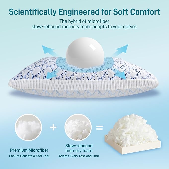- 【HYPOALLERGENIC & SAFE MATERIAL】 Our pillows are filled with hypoallergenic, freshly shredded memory foam. OEKO-TEX certified, they offer a safe, clean sleep environment, free from harmful substances and odors—ideal for those with allergic skin.