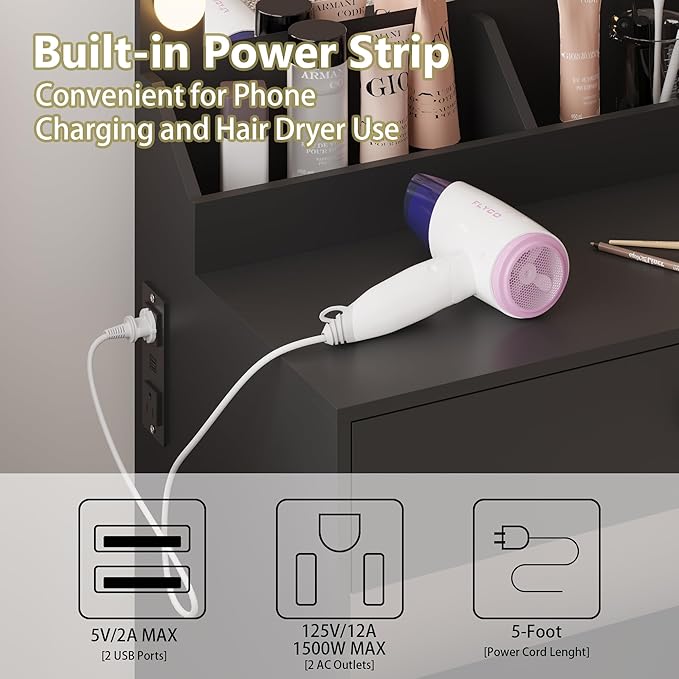 - Built-in Power Outlets and USB Ports - Stay connected while getting ready with the integrated charging station, featuring two AC outlets and two USB ports. Conveniently use hair tools, charge your phone, or power beauty devices without leaving your seat