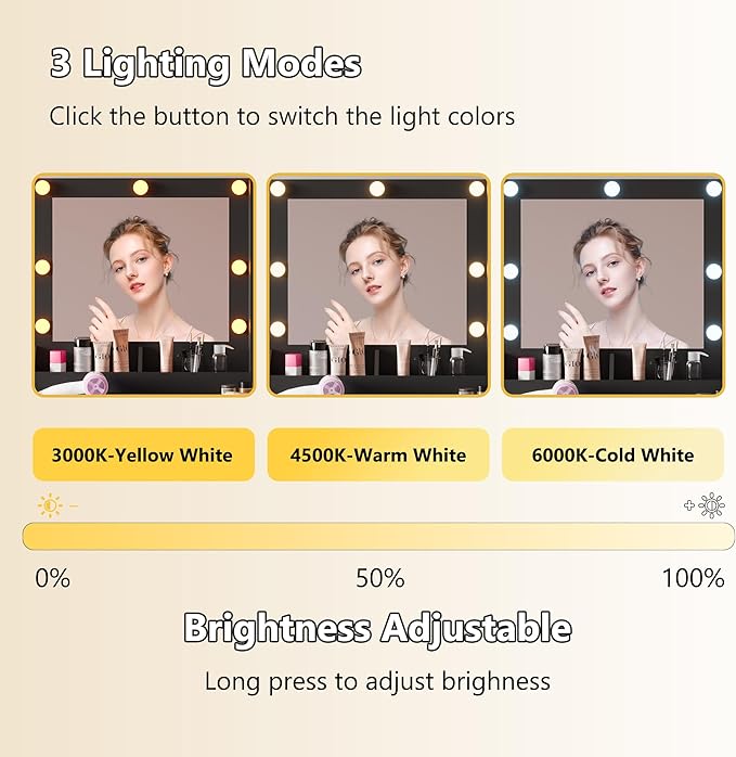 - Vanity Desk with Adjustable Lighting – BORNOON small makeup vanity desk features a large mirror surrounded by seven LED bulbs, offering three lighting modes: warm white, natural white, and cool white. With adjustable brightness, you can create the perfect lighting for makeup, live streaming, or salon use