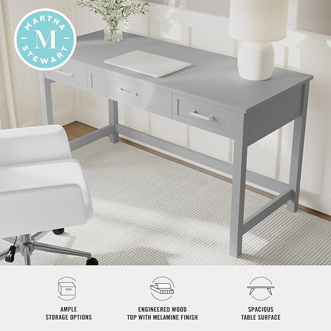 Martha Stewart Hutton Shaker Style Home Office Desk with 3 Drawers in Gray with Brushed Nickel Hardware