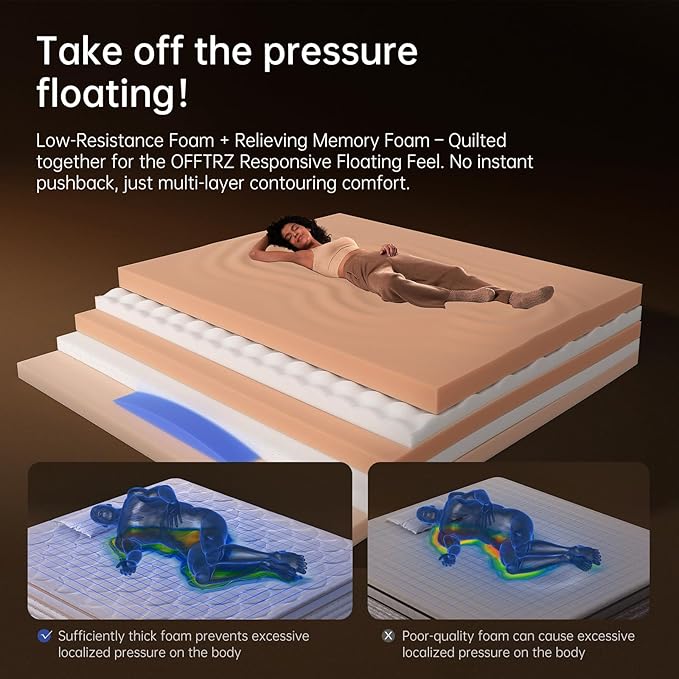 - SLEEP YOUR WAY — SIDE, BACK, OR STOMACH:OFFTR Z 14 Inch Queen Size Hybrid Mattress adapts to your sleeping style. The plush comfort layer, combining low-resistance foam and gel memory foam, gently cradles your body’s curves. Beneath, responsive pocket coils provide dynamic support, keeping your spine aligned all night.