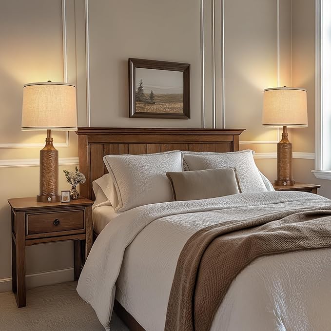 - 【Classic Design】: polka dots are hand-carved around the cylindrical resin lamp body, and the delicate matte texture makes our living room table lamp set of 2 look more premium and stylish. The metal base with antique finish craftsmanship, rich vintage finish and linen round lampshade add simplicity and elegance to the design, making the whole lamp look more complete. Perfect for your bedroom, living room and office.