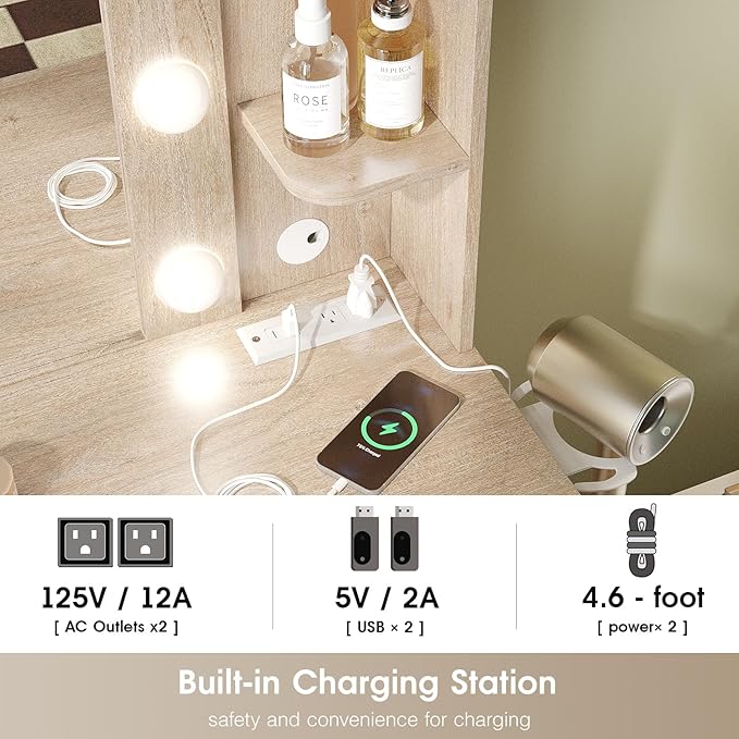- 【Built-in Power Outlet】A seamlessly embedded power strip with AC outlets and USB ports on the desktop ensures easy access to electricity for styling tools, phones, or other devices, keeping cords organized and your workspace clutter-free.