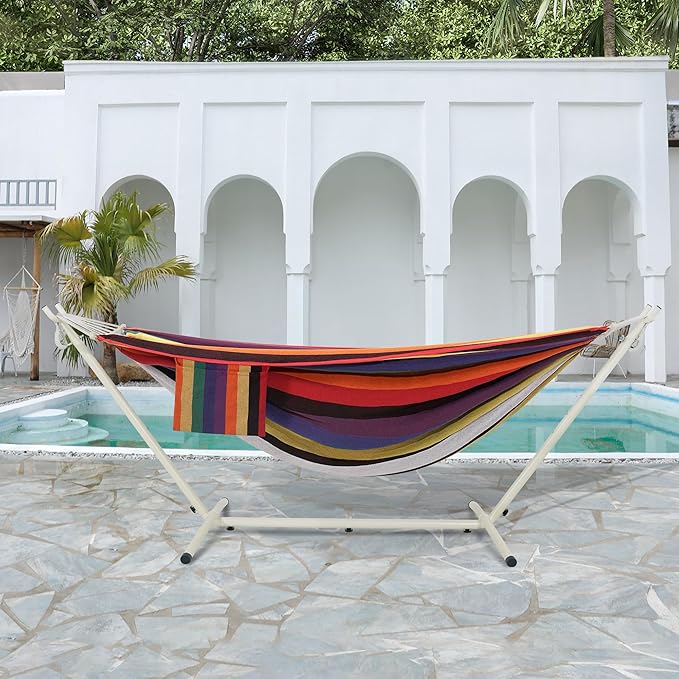 - Versatile for Multiple Outdoor Scenarios Whether you're in your garden, yard, or on a camping trip, this hammock is designed for various outdoor settings. The wooden spreader bars make it easy to get in and out, enhancing your comfort and convenience
