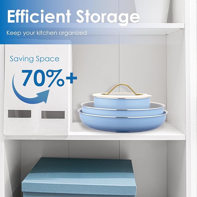 - Space Saving: ONGIFT stackable pots and pans set with detachable handles keep the kitchen organized and tidy, saving 70% of space, storage is simple. Perfect for kitchen and an ideal choice for RVs or campers