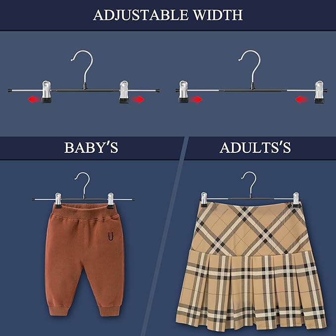 - Skirt Hangers Adjustable Clips: Skirt hangers with clips come with 2 adjustable clips, you can move the Skirts hangers to fit different sizes of pants, skirts, jeans, shorts, scarf, underwear, socks, Towel, hat, tie