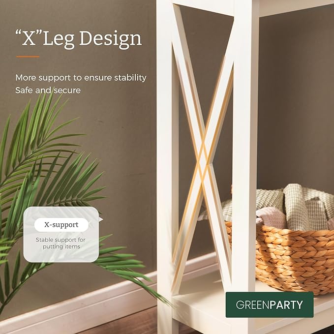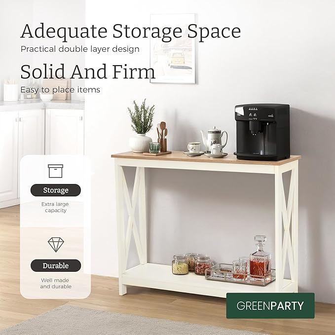 GREEN PARTY Vintage Farmhouse Entryway Console Table, 2-Tier Narrow Sofa Table with Storage Shelf for Living Room and Hallway, Rustic White Accent Furniture with Sturdy X-Shaped Legs