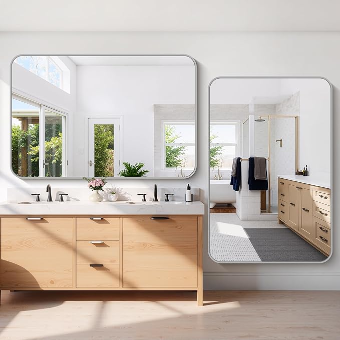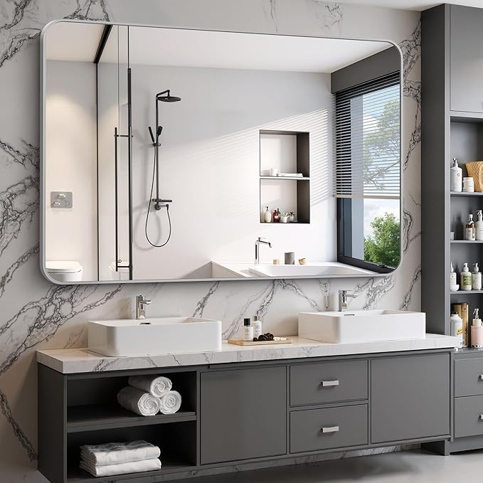 - MODERN STYLE SILVER BATHROOM MIRROR: The dimensions of this bathroom mirror is 60 x 40 inch, perfect size for you to get a true and reliable images at multiple angles and distances. Designed minimalist modern style combine practicality and aesthetics. Suitable for anywhere a mirror might be needed. Such as bathroom, cloakroom, dressing room, living room, bedroom, entryway. Bring more style and brightness to your home. It's also a wonderful housewarming gift for friends and families.