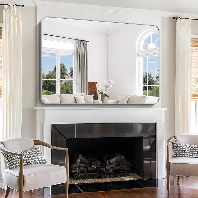 - ELEGANT ROUND CORNER DESIGN: This wall mounted rectangular mirror features smooth rounded corners design that adds a soft aesthetic to the space. The rounded corners design also help to avoid the risk of being scratched by the corners of the mirror, safety and elegance, give you a better sense of use. Not only functional but also decorative. Make your whole room elegance and enhance your home decor.