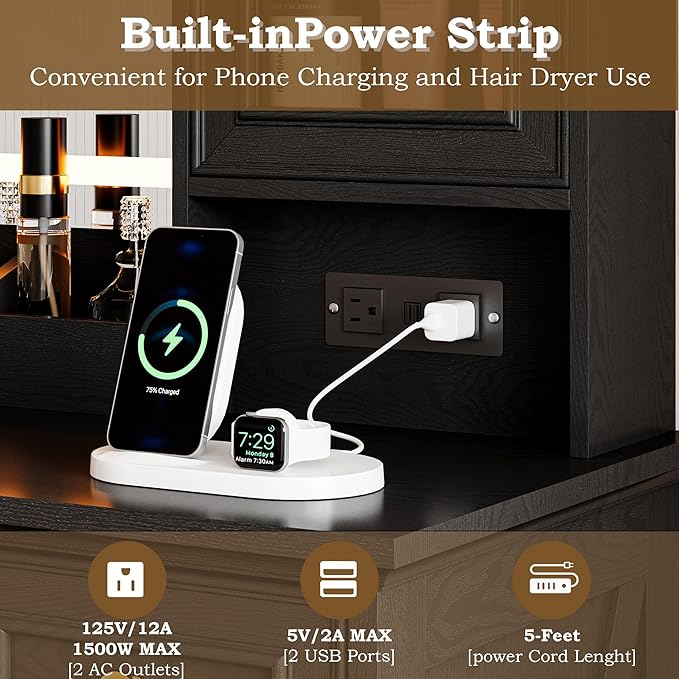 - Ample Storage & Built-in Power Outlets: BORNOON vanity offers 6 drawers, 2 RGB-lit glass cabinets, 3 makeup trays, and a spacious tabletop for easy organization. The built-in power strip with 2 AC outlets and 2 USB ports lets you conveniently charge beauty tools and devices.