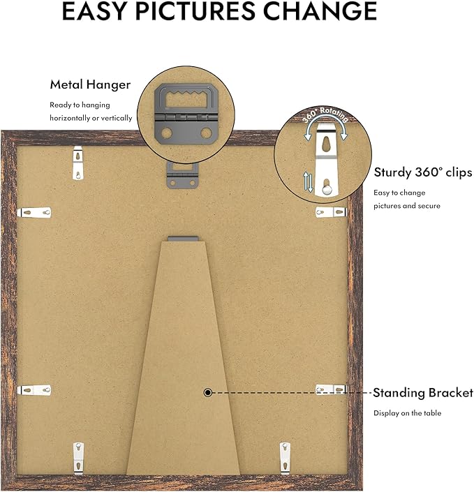 - Easy to Use! The frames 12x12 come with flexible swivel tabs on the back, Spring type action to remove the backing, without hurting fingers. It's easy to open and put in photos, so you interchange photos regularly with confidence