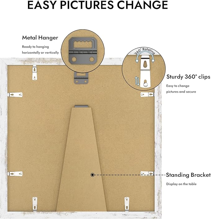 - Easy to Use! The frames 12x12 come with flexible swivel tabs on the back, Spring type action to remove the backing, without hurting fingers. It's easy to open and put in photos, so you interchange photos regularly with confidence