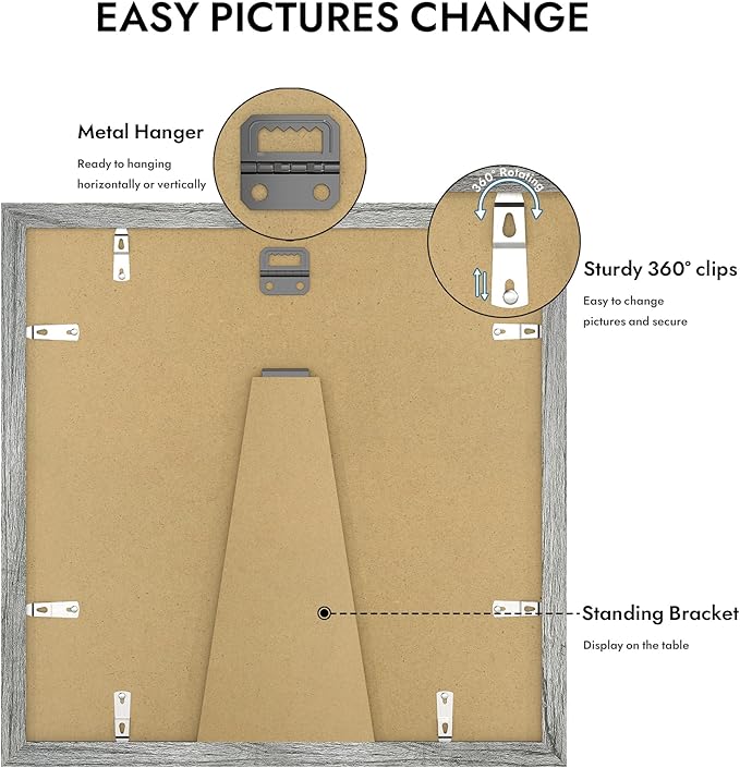- Easy to Use! The frames 12x12 come with flexible swivel tabs on the back, Spring type action to remove the backing, without hurting fingers. It's easy to open and put in photos, so you interchange photos regularly with confidence
