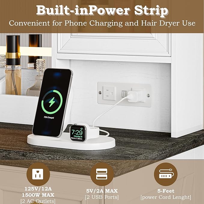 - Ample Storage & Built-in Power Outlets: BORNOON vanity offers 6 drawers, 2 RGB-lit glass cabinets, 3 makeup trays, and a spacious tabletop for easy organization. The built-in power strip with 2 AC outlets and 2 USB ports lets you conveniently charge beauty tools and devices.