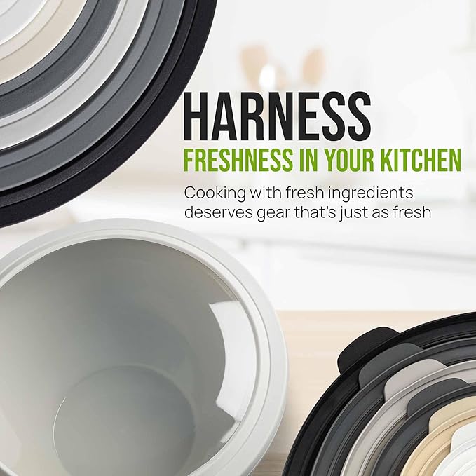 - KEEPS FOOD FRESH: These kitchen mixing bowls come with tight fit lids that prevent the air from getting in and out and also allow transporting food without any spills. The transparent plastic material allows you to take a peek at the food without opening it every time.