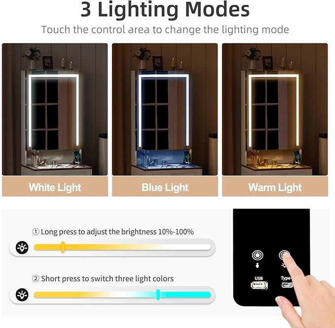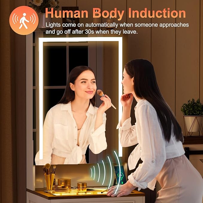 - 【Lighted mirror&Human Senor】The vanity mirror offers 3 light colors, cold light, natural light, and warm light and human body sensor. Adjust the lighting mode and change the brightness by touching the button.When you approaches Makeup Table, the lights will automatically light up and turn off when you leave