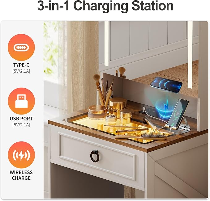 - 【Convenient Charging Station】Vanity desk includes Wireless Charging Station and USB & Type-C Port for conveniently charging your phone, which is perfect for bedroom or living room.Besides,our vanity set features a transparent glass top for classified storage,easily find the cosmetics you need