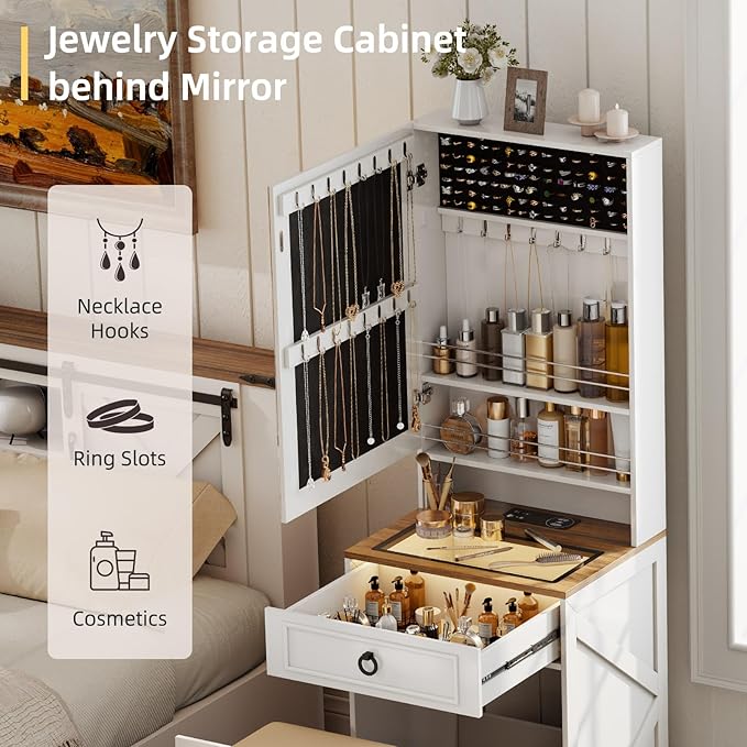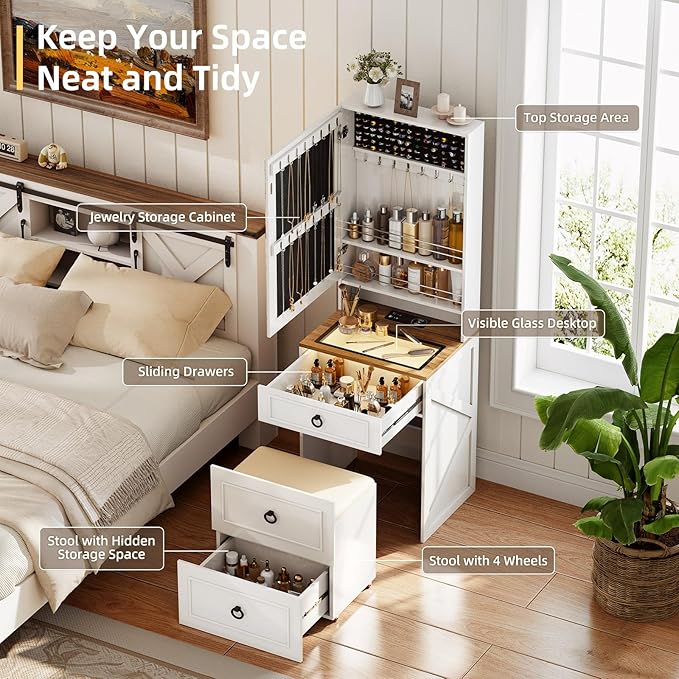 - 【Elegant Design for Jewelry Storage】This Vanity Table Set has an extra Jewelry Storage.it can accommodate 108 rings/ earrings, 30 necklaces/bracelet hooks, easily store all of your jewelry. And this jewelry storage cabinet can protect your jewelry from dust