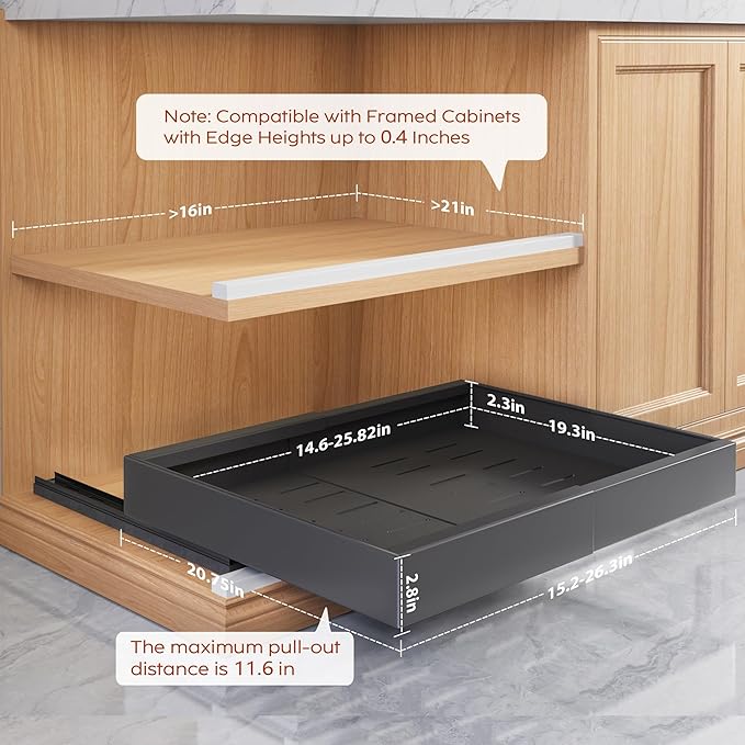 - Important Note: To ensure compatibility, please note that this drawer is suitable for cabinets with a width exceeding 16" and a depth exceeding 21". Please measure your cabinet in advance.Note: Compatible with Framed Cabinets with Edge Heights up to 0.4 Inches.