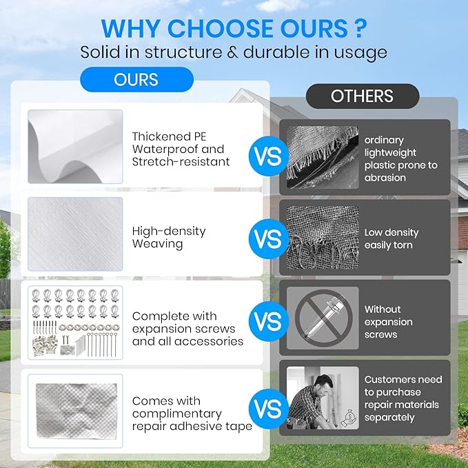 - 【Waterproof All-Season Car Canopy】This all-weather car canopy features a reinforced triple-layered 180g polyethylene fabric that is tear-proof, waterproof, and UV resistant. The sturdy canopy cover is securely attached to the frame using elastic ball bungees and buckles, ensuring reliable protection for your vehicle and other items throughout the year. Besides, bonus repair adhesive tape is included for any necessary cover repairs.