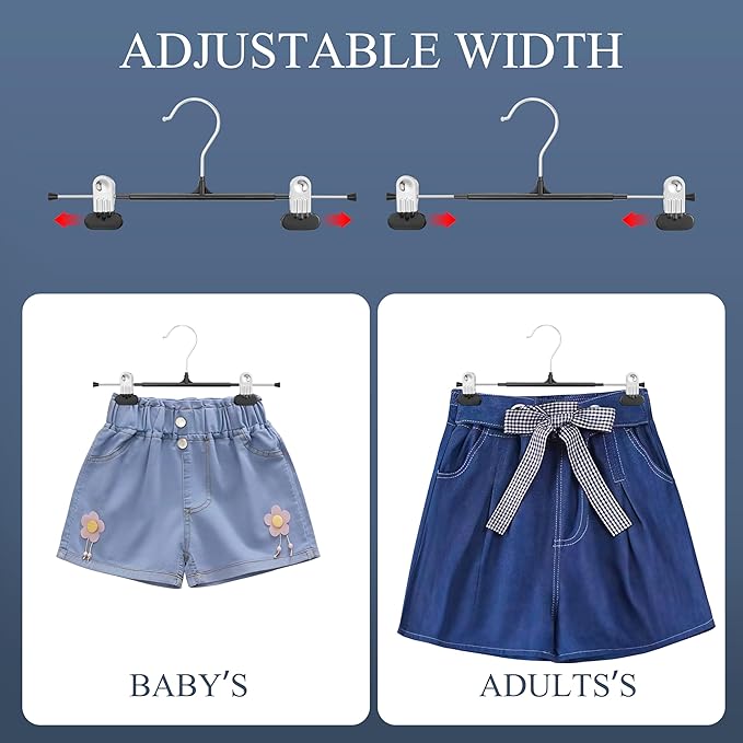 - Adjustable skirt hanger with wide clips: This skirt hanger for womens features 2 movable clips with a wide contact surface, providing strong clamping force. It can be adjusted to fit a variety of garments, including skirts, pants, jeans, and more