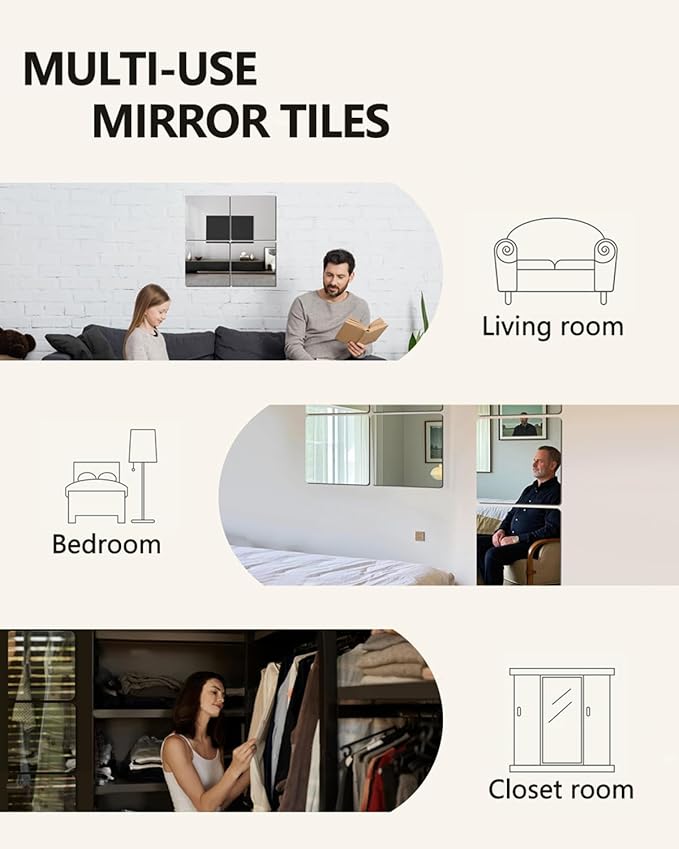- Safe and Unbreakable: Wall mounted mirror tiles glass edges are ground smooth, finished with a shiny or glossy polish, you don't have to worry about your hands getting injured when installing. Glass mirror tiles crafted from shatterproof materials making it perfect for homes with children or pets.
