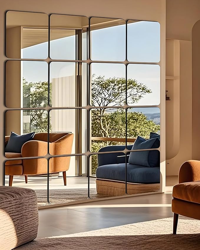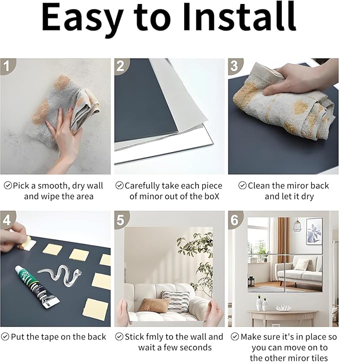 - Safe and Unbreakable: Wall mounted mirror tiles glass edges are ground smooth, finished with a shiny or glossy polish, you don't have to worry about your hands getting injured when installing. Glass mirror tiles crafted from shatterproof materials making it perfect for homes with children or pets.