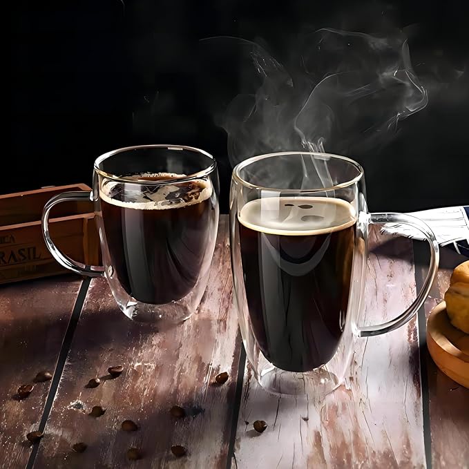 - COFFEE MUGS, ENJOY LIFE: Double walled, Borosilicate material, Insulated glasses.you can enjoy your cup of coffee, espresso, cappuccino or tea warmer longer.When you have hot coffee, you won’t feel hot from outside and when you have cold drink,there is no condensation on the glass and table.
