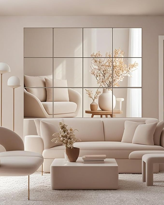 - 🔅[SIZE-PLATFORM MIRRORS]: 12 frameless real glass mirrors, each mirror tile measures 12 x 12 inches. Advanced polishing technology makes the edges safe and delicate.