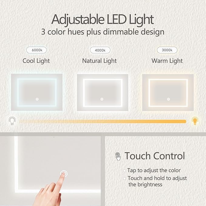 - 【DIMMABLE LED LIGHTING】The vanity's oversized mirror features 3 professional lighting modes, delivering perfect illumination for makeup application and styling. Easily switch color temperatures with a touch or hold to dim - creating customizable ambiance for any occasion.