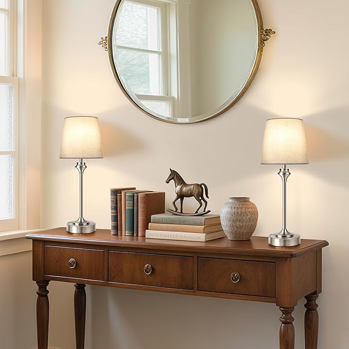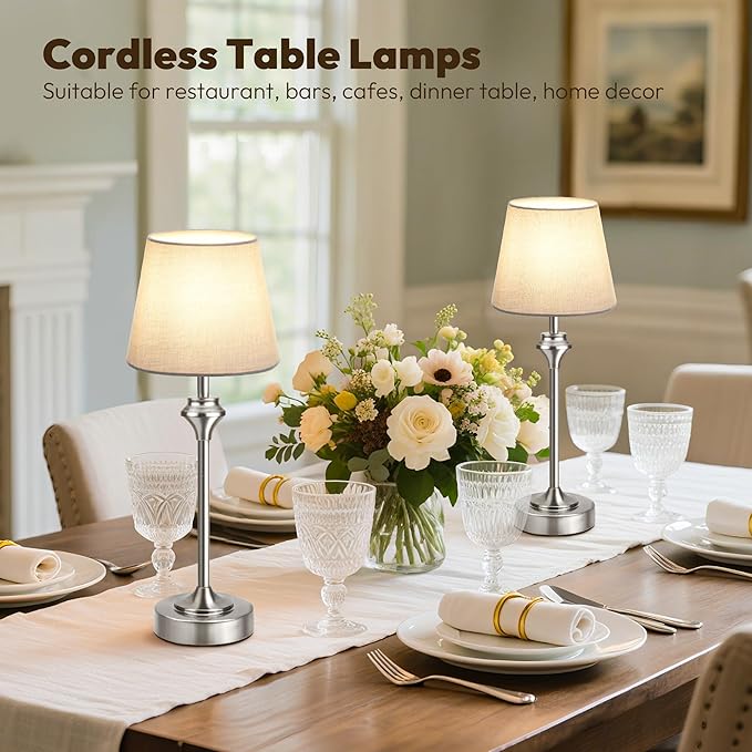 - 【Unique Design】This portable cordless table lamp combines a modern and vintage look with a minimalist base and fabric shade, and be crafted from durable aluminum with an electroplated finish, offering a smooth, textured appearance that adds elegance and sophistication,making it timeless.The non-slip silicone base prevents slipping and accidental tipping,its contemporary metal finish and warm, cozy light create a romantic and elegant atmosphere, making it a unique addition to any room,especially those with a farmhouse decor style. Additionally, it makes an excellent gift for friends, loved ones, and family!