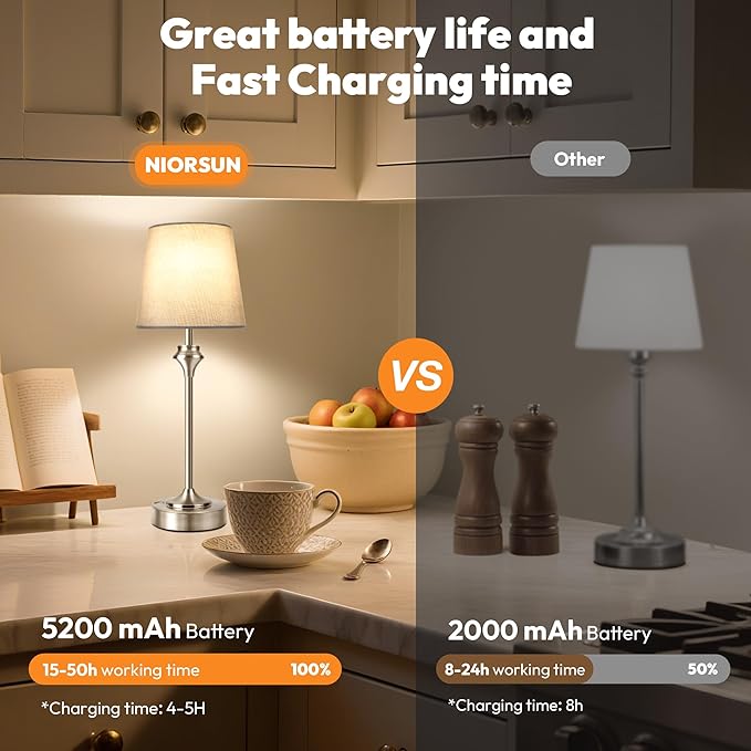 - 【3-Way Dimmable&Touch Control】NIORSUN portables cordless table lamp with three brightness settings,you can change the lighting brightness according to your different needs. Smply change the intensity of the light by touching the power button, sequentially to achieve the desired brightness. Short touch for 3-way brightness changing(100%/60%/25%).The lowest setting could be used an ambient light or night light. The highest setting is suitable for desk or bedside reading.you can change the lighting brightness according to your different needs.