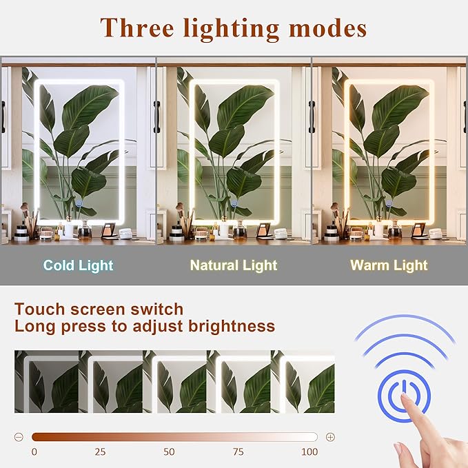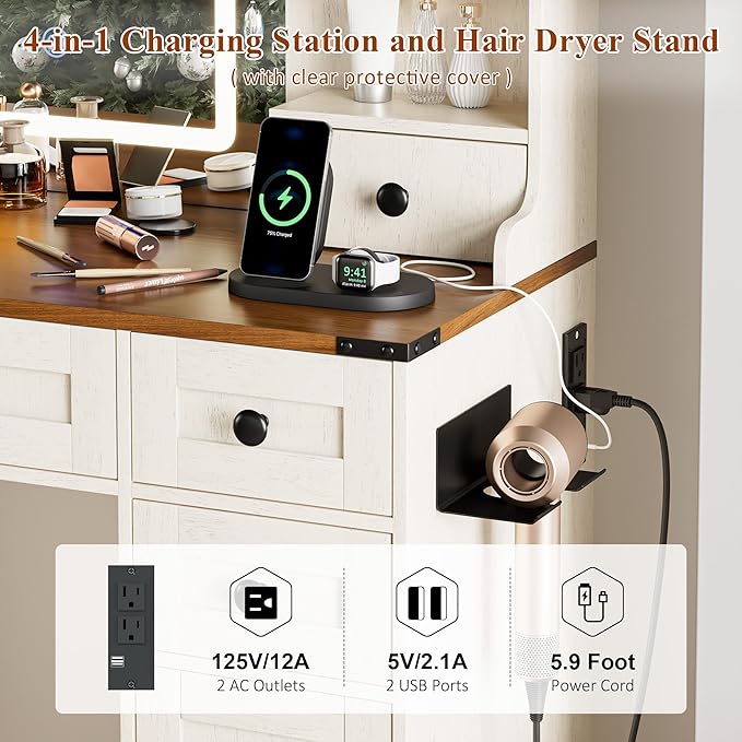 - 【Large Vanity Mirror with Lights】This vanity desk features a large makeup mirror equipped with LED lights that offer three color modes (natural, warm, and cool light). Each mode allows you to adjust the brightness to suit your needs, ensuring perfect lighting for makeup application, skincare routines, or hairstyling.