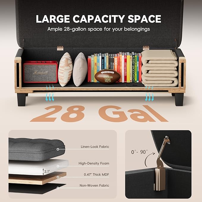 - 【Spacious Hidden Storage】The storage benches have huge storage space of 28 Gal, suitable for Storage of blankets, books, stereos, etc., all items are put into the hidden space, will not affect the beauty and cleanliness of the space