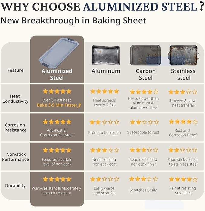 - Upgrade to Heavy-Duty Aluminized Steel: Enjoy 50% more durability and 70% better heat distribution with our 0.6mm thick heavy-duty aluminized steel baking trays for oven. With superior rust resistance and nonstick performance, these trays outshine aluminum, carbon steel, and stainless steel. They can withstand up to 500°F, ensuring perfect baking results every time.