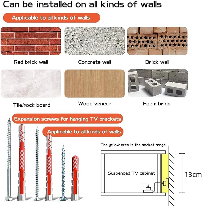 - 【Easy Installation】 The TV cabinet is pre-assembled, so you can install it on the wall right after it arrives, with no assembly required. It's suitable for various wall types, including brick, concrete, tile, stone, and wood, but not for hollow or plaster walls. The maximum weight capacity is 100 kg, ensuring safety and stability.
