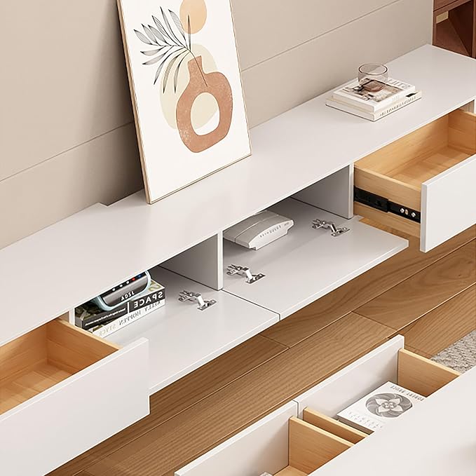 - 【Ample Storage Space】The TV stand comes with spacious, separate compartments, providing ample storage space for items like routers, power cables, and other accessories, helping to keep your space neat and organized. Built-in pre-cut cable openings allow for efficient cable management, reducing clutter and enhancing the user experience.