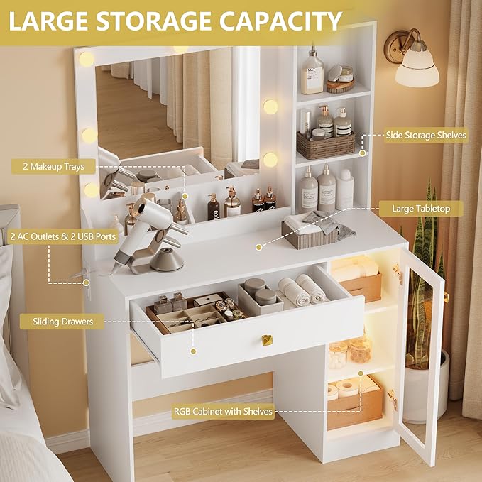 Vanity Desk with Mirror and Lights, Small Makeup Vanity Table with RGB Storage Cabinet & Power Strips & Shelves, 3 Lighting Modes & Adjustable Brightness, Dressing Table for Women Girls Bedroom, White