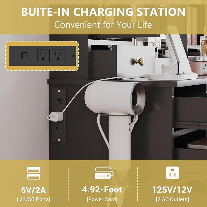 - Convenient Power Station & Hair Dryer Holder: Equipped with 2 AC outlets and 2 USB ports, this vanity allows you to charge devices and power hair styling tools simultaneously. The dedicated hair dryer rack ensures that your essentials are always within reach, making your beauty routine more efficient.