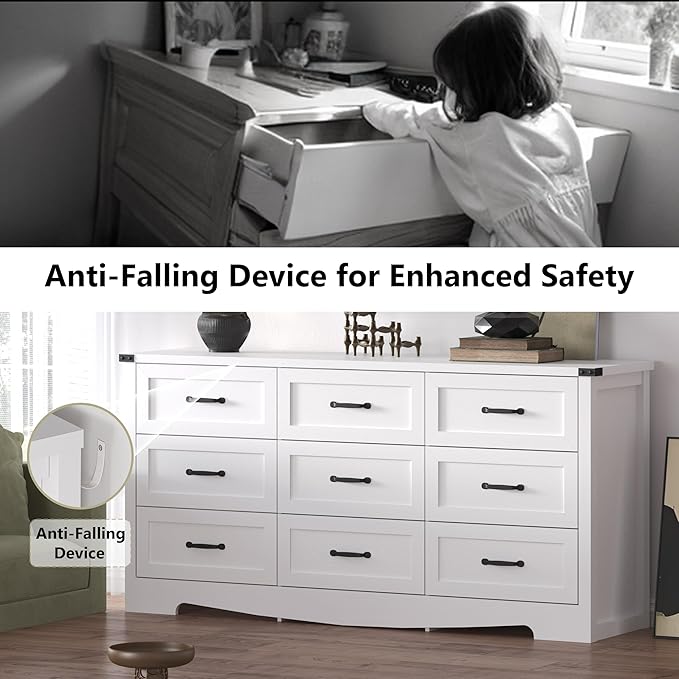 - 【Modern 9 Drawer Dresser for Bedroom & More】 Elevate your bedroom with this modern dresser that combines sleek design and ample storage. Measuring 15.75"D x 59.05"W x 29.52"H, it works perfectly as a dresser for bedroom, TV stand with storage, or closet dresser. The wide top offers space for décor, photos, or essentials, making it a versatile piece for any room.